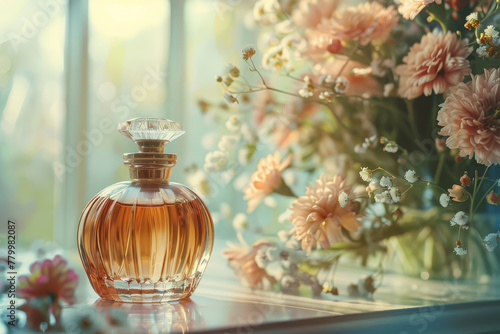 A bottle of perfume is sitting on a table next to a vase of flowers