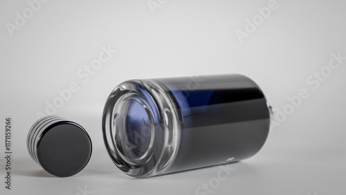A bottle of perfume with a cap on top. The bottle is blue gradient glass premium photo 3d render