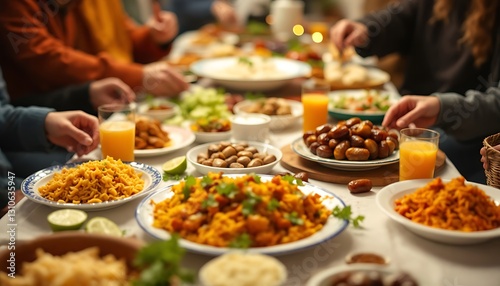 family, food, meal, gathering, dinner, table, dish, delicious, ramadan, date, juice, orange, pasta, rice, noodle, cookery, culinary, togetherness, celebration, sharing, community, tradition, culture, heritage, home, warmth, joy, abundance, blessing, grateful, tasty, appetising, flavorful, satisfying, plentiful, festive, opulent