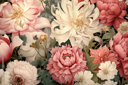 floral, bouquet, pink, white, flower, arrangement, bloom, delicate, romantic, art, illustration, nature, flower petals, leaf, stem, green, soft, light, pastel, high-coloured, beautiful, elegant, lush, fresh, garden, spring, summer, beauty, colours, texture, pattern, abstract, design, painting, artwork, closeup, macro, vintage