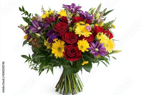 A bouquet of flowers with a mix of bright red roses, yellow daisies, and purple lilies.