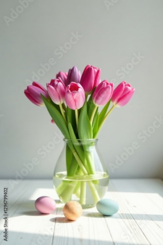A bouquet of pink tulips in a clear glass vase, accented by pastel-colored eggs on a sunlit white wooden surface.