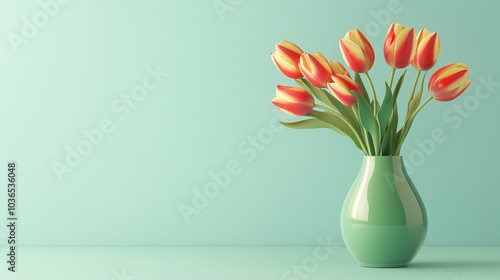 A bouquet of pink tulips is arranged in a soft green vase, set against a pastel green background.