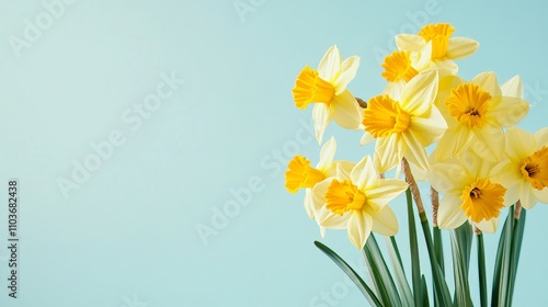 A bouquet of vibrant yellow daffodils on a pale sky blue background, close-up shot, Minimalist style