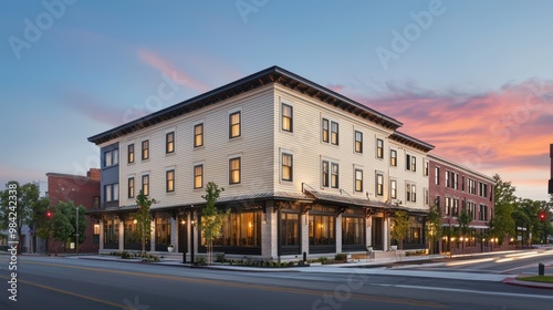 A boutique hotel with intricate James Hardie siding, located in a historic downtown district, blending traditional architecture with modern fire-resistance and insulation properties