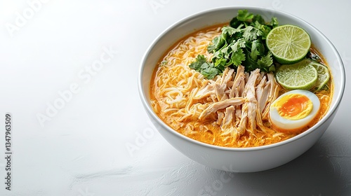 noodle, soup, bowl, chicken, egg, lime, cilantro, food, dish, cookery, asian, meal, delicious, tasty, savoury, orange, broth, garnish, texture, appetising, fresh, bright, vibrant, closeup, ingredient, cooking, culinary, studio, background, isolated, macro, detail, healthy, diet, lunch, dinner, mealtime, eat, favor, alimentary, prepared, arrangement, composition, epicure, warm, served