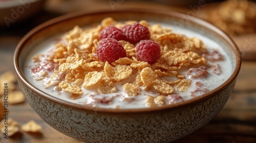 A bowl filled with creamy, frothy milk, its surface glistening with a sheen of freshness, awaited its destiny to be joined by a symphony of crunchy, golden flakes, creating a breakfast masterpiece.