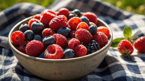 A bowl filled with fresh berries resting on a checkered cloth in natural light.