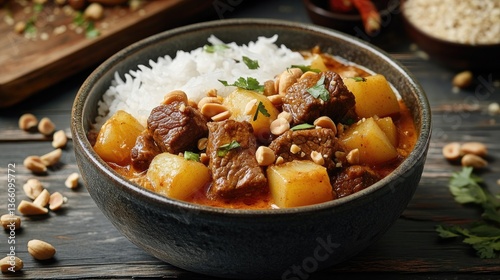 A bowl of aromatic Thai Massaman curry, filled with beef chunks, potatoes, and peanuts, is artfully presented with jasmine rice, suggesting culinary comfort.