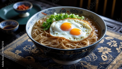 A bowl of boiled noodles with fried egg that looks very delicious on a very elegant table mat, dark food photography