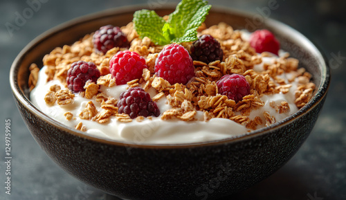 bowl, cereal, raspberry, mint, black, crunchy, healthy, breakfast, dessert, food, granola, yogurt, muesli, fruit, organic, fresh, snack, milk, natural, dairy, oat, diet, spoon, oatmeal, blueberry, berry, homemade, delicious, sweet, vegetarian, closeup, meal, background, wooden, yogurt, honey, white, tasty, eat, greek, nut, nourishment, table, almond, morning, strawberry, glasses, crispy, cream