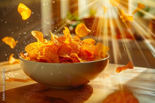 indoor, food, flower, glasses, plant, orange, bowl, orange, cereal, chips, table, fall, potato, splash, white, chips, sun, shining
