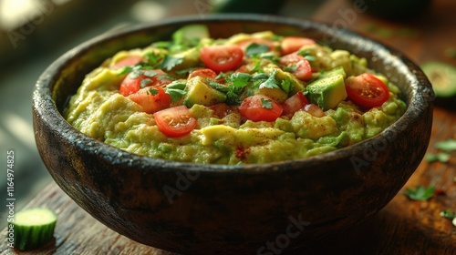 A Bowl of Creamy Guacamole on a Rustic Wooden Table with Fresh Ingredients Surrounding It