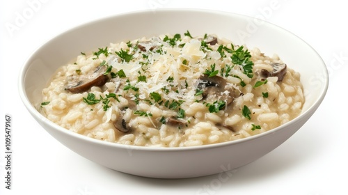 bowl, creamy, mushroom, risotto, garnished, freshly, grated, parmesan, cheese, chopped, parsley, each, grain, rice, cooked, perfection, set, isolated, white, background, accentuate, rich, comforting, texture