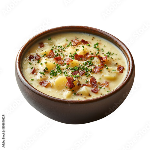 A Bowl of Creamy Potato Soup Garnished with Chives and Bacon Isolated on Transparent Background
