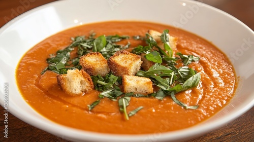 A bowl of creamy tomato soup with fresh basil and croutons. Featuring cozy meals