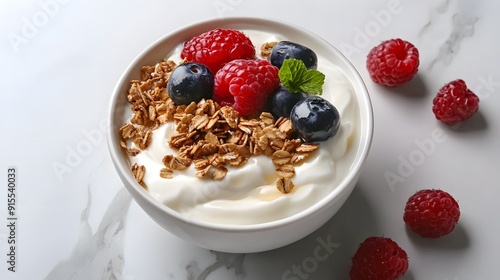 A bowl of creamy yogurt topped with granola, honey, and fresh berries, arranged on a marble countertop, capturing a healthy and balanced breakfast option