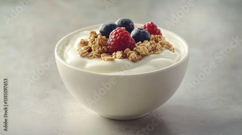A bowl of creamy yogurt with granola and fresh berries. Featuring healthy indulgence