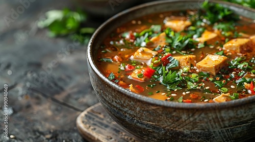 soup, bowl, herb, vegetable, tofu, chili, broth, garnish, cookery, meal, cooking, ingredient, favor, healthy, spicey, comfort, dinner, receipe, nourishment, aromatic, fresh, culinary, seasoning, texture, warmth, vibrant, colourful, savoury, hot, organic, homemade, traditional, delicious, appetising, wholesome, vegetarian, alimentary, steaming, dish, food, dining, indulgent, variety, presentation, life events, culture