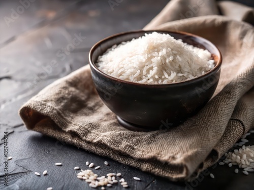 a bowl of fluffy white rice sits atop a linen cloth, showcasing the grains' texture and form