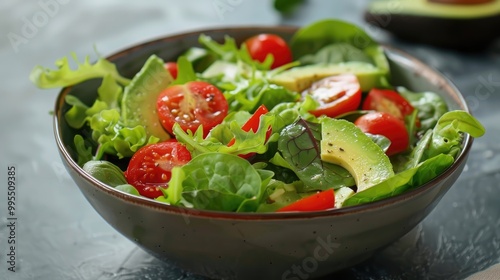 A bowl of fresh green salad with avocado and cherry tomatoes.
