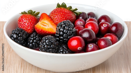 A bowl of fresh strawberries, blackberries, and cranberries.