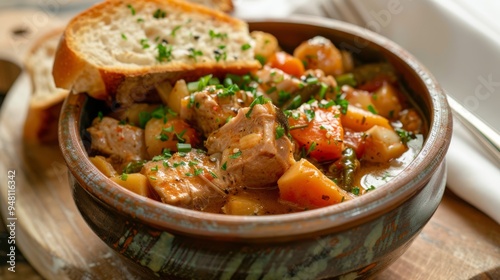 bowl, hearty, pork meat, stew, vegetable, served, slice, crusty, bread, side, meat, food, meal, beef, dish, dinner, vegetable, cooked, traditional, onion, hot, sauce, carrot, roasted, background, cookery, homemade, lunch, potato, goulash, closeup, healthy, table, rustic, pot, wooden, epicure, parsley, delicious, green, pepper, view, gravy, receipe, horizontal, fresh, spoon, fried, plate