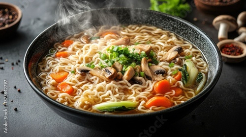 a bowl of hot, delicious ramen noodles with vegetables and mushrooms. Steam rises from the bowl, inviting you to taste the flavorful broth