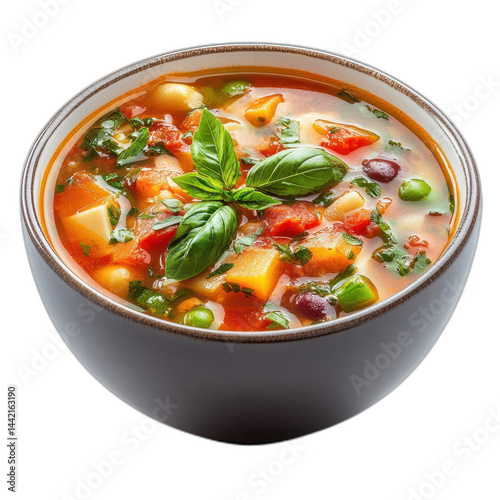 A bowl of minestrone soup with fresh basil leaves, isolated on transparent background.
