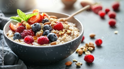 oatmeal, berry, nut, honey, breakfast, healthy, food, delicious, morning, meal, bowl, fruit, almond, raspberry, blueberry, strawberry, mint, creamy, texture, sweet, nutty, healthy eating, alimentary, energy, morning meal, healthy breakfast, food photography, health food, tasty, vibrant, colourful, appetising, fresh, natural, wholesome, good morning, healthy lifestyle
