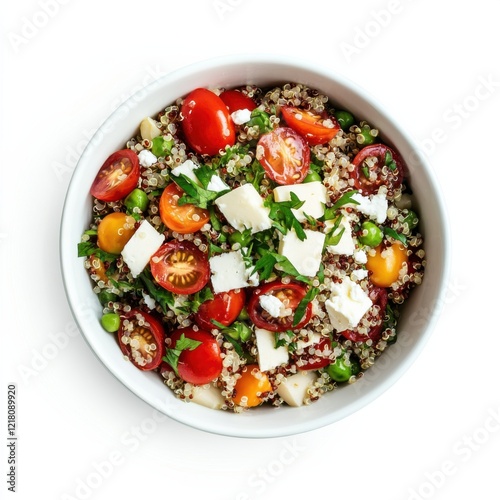A bowl of quinoa salad with cherry tomatoes and feta cheese, isolated white background, modern art style