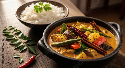 rice, curry, vegetable, spice, food, dish, meal, cookery, asian cuisine, okra, aubergine, red pepper, cinnamon stick, cilantro, leaf, bowl, dinner, lunch