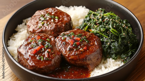 A bowl of rice topped with three meat patties in sauce and a side of sautéed greens.