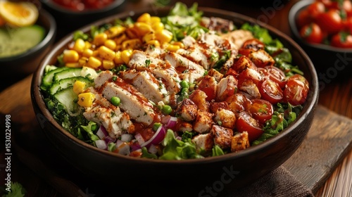 A bowl of salad with chicken and vegetables