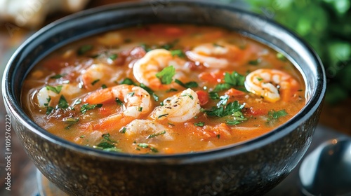 A bowl of shrimp soup garnished with herbs and vegetables, showcasing a hearty meal.