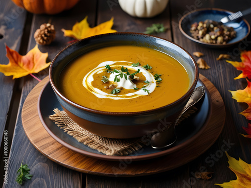 soup, food, bowl, vegetable, meal, pumpkin, dinner, healthy, spoon, cream, lunch, hot, orange, cookery, plate, vegetarian, tomatoes, dish, carrot, fresh, squash, epicure, white, vegetable, meat