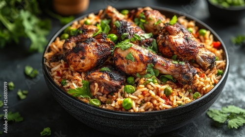 A bowl of spiced chicken drumsticks served over flavorful rice with green peas and herbs.
