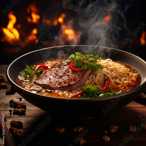 bowl, steaming, hot, ramen, noodle, soup, topped, stir-fried, pork meat, vegetable, rustic, natural, background, meal, meat, beautiful, colourful, green, red, spice, quality, traditional
