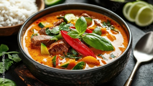 A bowl of Thai red curry with beef, with vibrant vegetables and a creamy coconut milk base, served with steamed rice and garnished with fresh herbs.