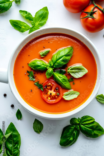 bowl, tomatoes, soup, basil, tomatoes, white, table, vegetable, pasta, sauce, garnish, herb, healthy, meal, food, dish, cooking, ingredient, receipe, cherry, herb, pepper, leaf, top, view, orange, colours, smooth, texture, garnished, fresh, slice, 2, whole, corner, placed, surface, background, aesthetic, appetising