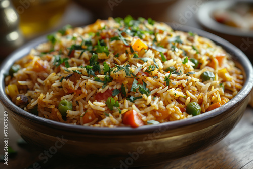 A bowl of vibrant vegetable rice with peas and cilantro garnished in an artistic setting, capturing the essence of a delicious meal