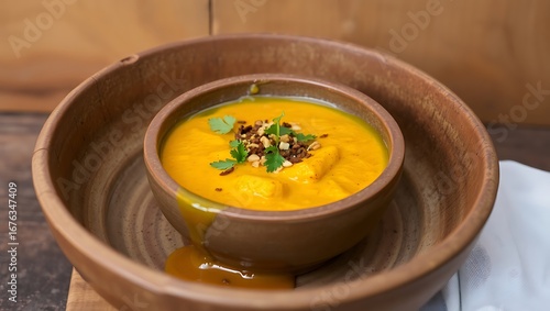 soup, wooden bowl, garnish, herb, nut, cilantro, food, cookery, dish, meal, lunch, dinner, healthy, vegetarian, vegan, delicious, tasty, appetising, presentation, rustic, table setting, closeup