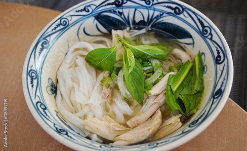 A bowl of Vietnamese noodle and chicken soup
