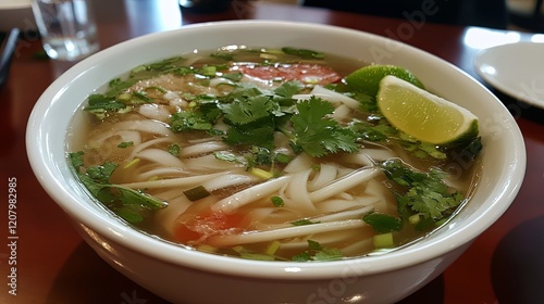 A bowl of Vietnamese pho with a few sprigs of cilantro and lime wedges on the side