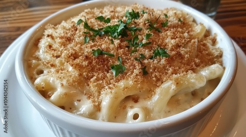 A bowl of warm, creamy mac and cheese with a crispy breadcrumb topping.