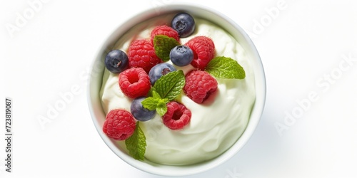 A bowl of yogurt topped with fresh berries and mint leaves. Perfect for a healthy and refreshing snack. Can be used for food and nutrition-related content