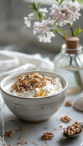 almond, bowl, cream, cereal, table, fill, flower, food, fruit, granola, milk, napkin, nut, oatmeal, oat, peach, peanut, pecan, spoon, vase, walnut, white, yogurt