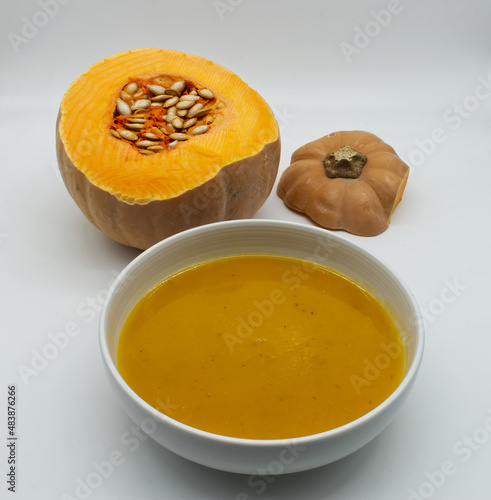 A bowl with pumpkin cream soup (vellutata di zucca) isolated on white background.