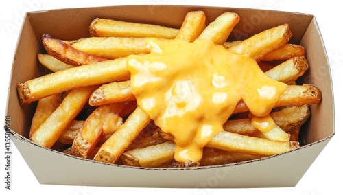 A box of french fries with a yellow cheese sauce on top