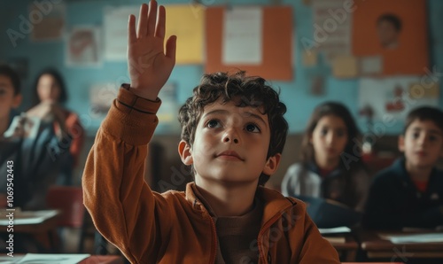 A Boy Raises His Hand in a Classroom Setting. Generative AI